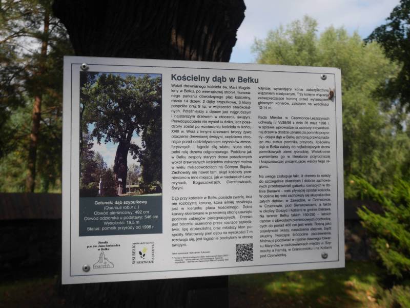 W Bełku, przy zabytkowym drewnianym kościele św. Marii Magdaleny, rośnie okazały dąb szypułkowy o obwodzie ok. 490 cm, pierśnicy ok. 150 cm i wysokości ok. 20 m. Drzewo znajduje się na terenie cmentarza otaczającego drewnianą świątynię z XVIII w., będąc najgrubszym i najstarszym wśród drzew okolicznych drzew, co dodatkowo podkreśla walory krajobrazowe i historyczne tego miejsca. Prawdopodobnie został posadzony po wzniesieniu kościoła. W 1998 r. dąb został uznany za pomnik przyrody, należy do najładniejszych drzew pomnikowych ziemi rybnickiej.