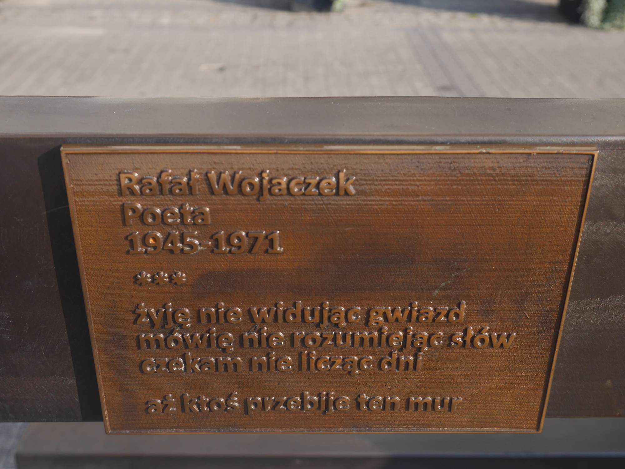 Ławeczka z rzeźbą Wojaczka powstała na bazie starych zdjęć poety jako jeden z elementów uczczenia 800-lecia miasta Mikołów.