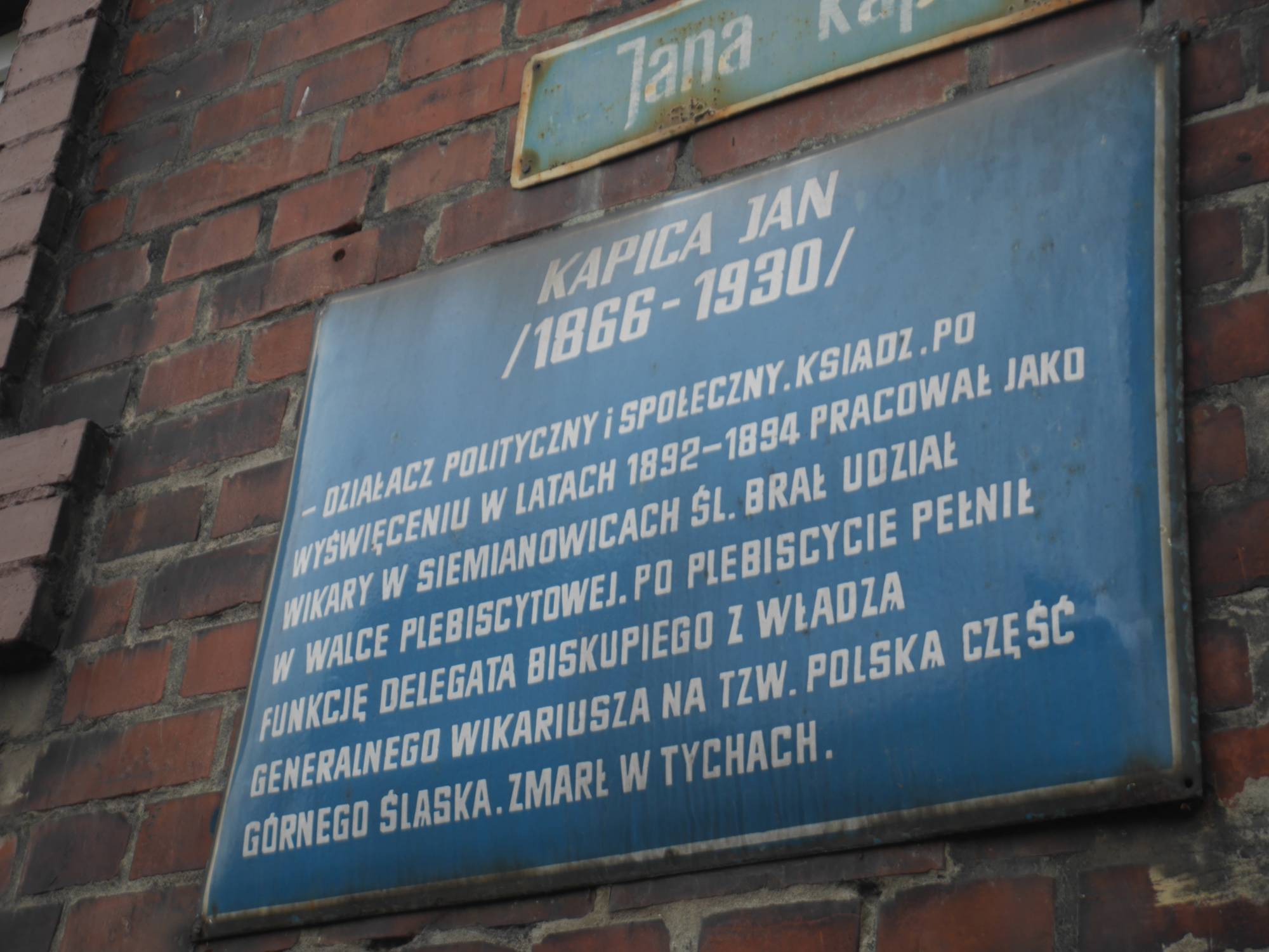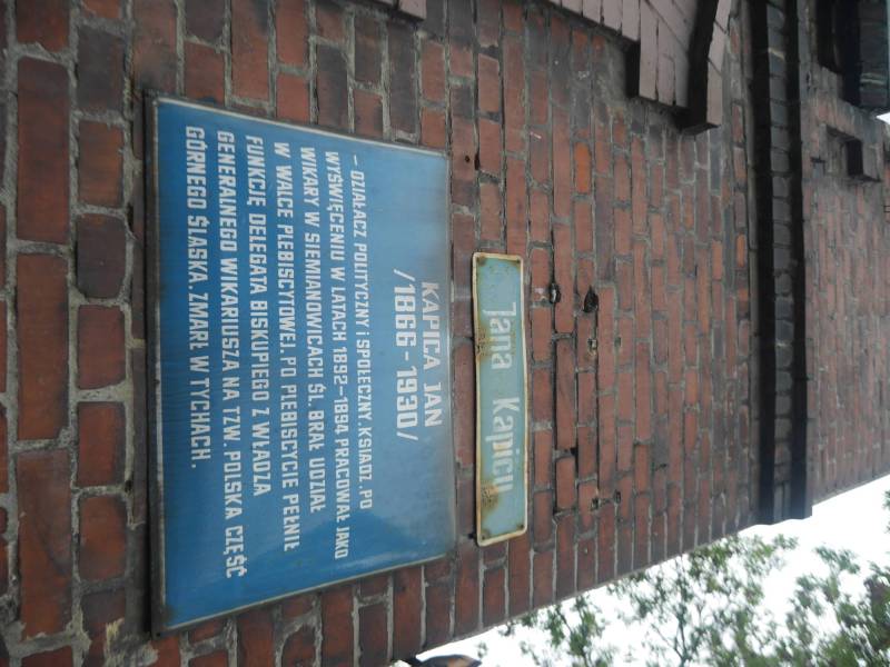 Upamiętnia ks. Jana Kapicę (1866–1930), katolickiego duchownego oraz aktywnego działacza społecznego i politycznego. Kapica ukończył gimnazjum w Pszczynie. Na przełomie wieków XIX i XX propagował ideę abstynencji. Od 1898 r. aż do śmierci w 1930 pełnił funkcję proboszcza parafii św. Marii Magdaleny w Tychach, gdzie przyczynił się do rozbudowy kościoła. Popierał partię Centrum i w 1908 r. został posłem do parlamentu pruskiego. Wcześniej, od 1892 r., był wikarym w parafii Podwyższenia Krzyża Świętego w Siemianowicach.