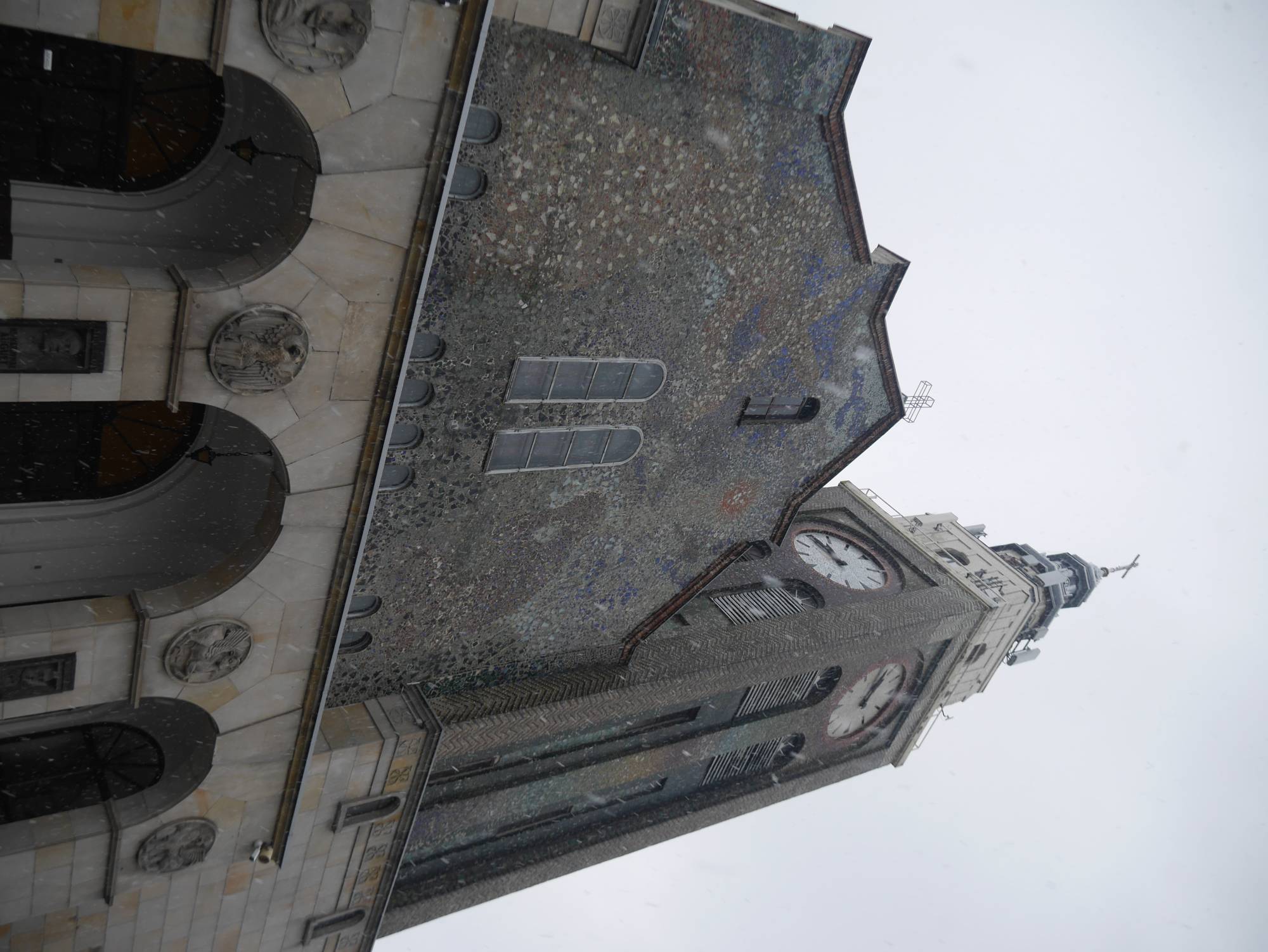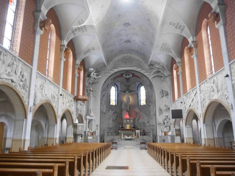 Jednonawowa bryła świątynia ma dwa podcienia po bokach i centralnie podwyższone prezbiterium. Nawa nakryta jest sklepieniem kolebkowym, a sufit zdobi mozaika przypominająca firmament. Budulec na schody kościoła pochodzi z rozebranej wieży Bismarcka, stojącej w znajdującym się nieopodal Trójkącie Trzech Cesarzy, gdzie stykały się granice Prus, Austrii i Rosji.