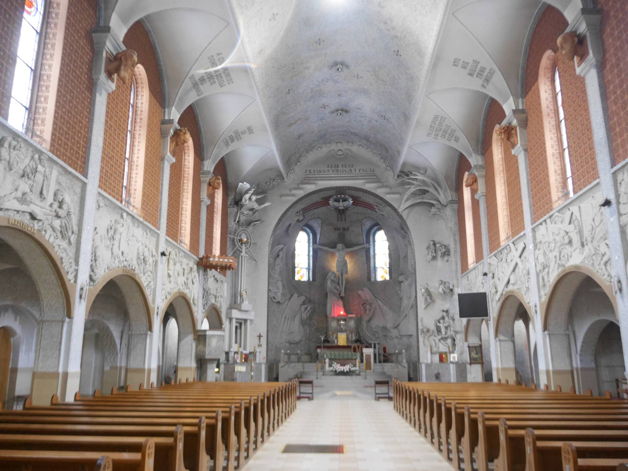 Autor wystroju wnętrza, Henryk Burzec, nadał kościołowi wyrazisty, ekspresyjny styl, łącząc klasyczny temat sakralny z nowoczesną formą rzeźby. Sam rzeźbiarz znany jest również z prac przy Pomniku Powstańców Śląskich na Górze Św. Anny i swoich zakopiańskich realizacji plenerowych.